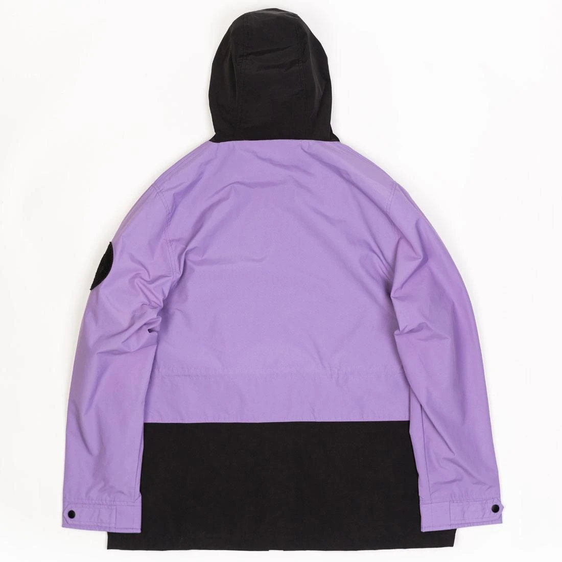 Colorblock bonded nylon anorak with front placket print. Featuring tonal embroidered felt sleeve patch, waist bungee, adjustable cuffs, & molded front zipper.