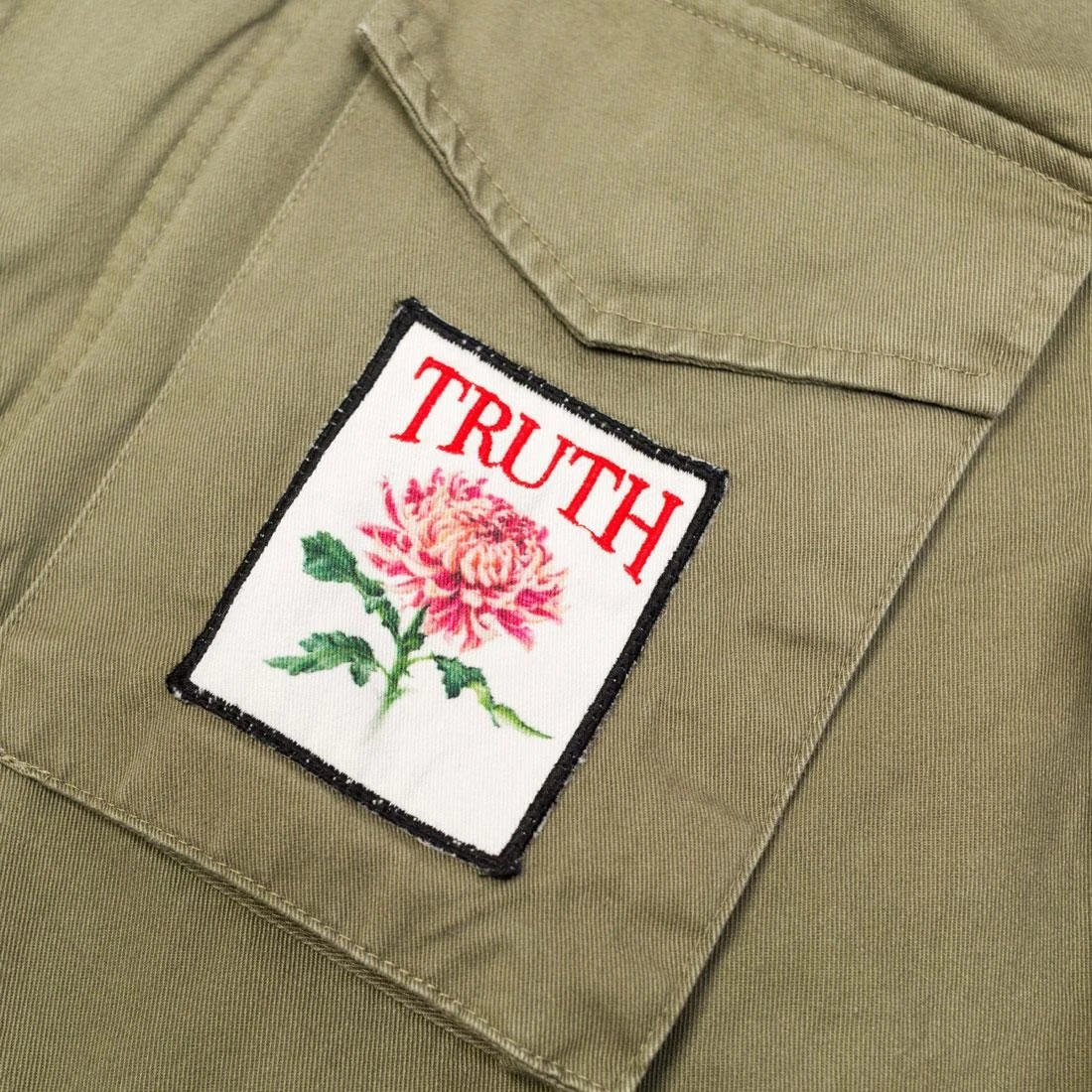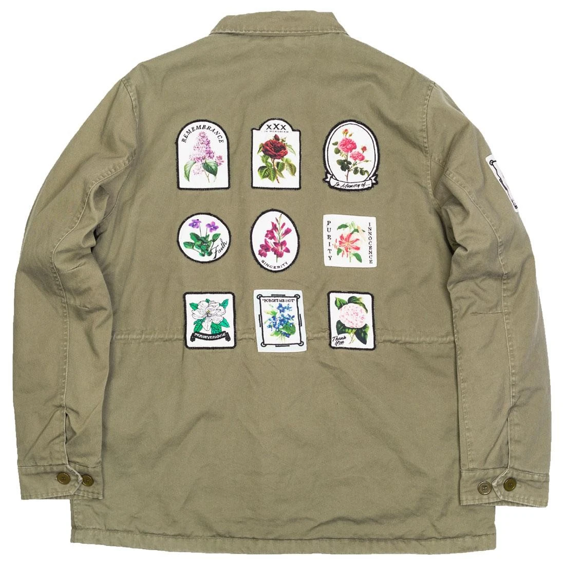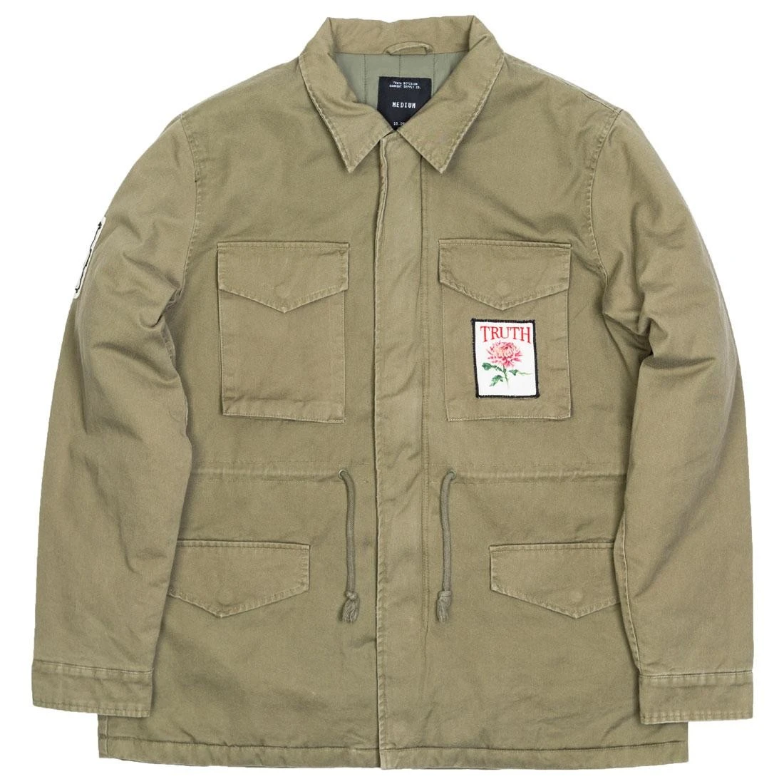 Classic cotton M-65 field jacket, featuring heavy weight brass 2-way front zipper, quilted lining and an array of embroidered and printed patches.