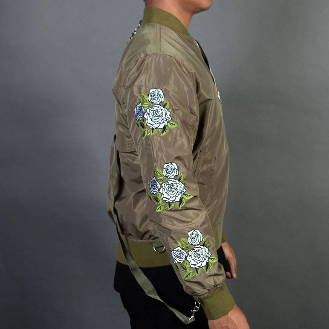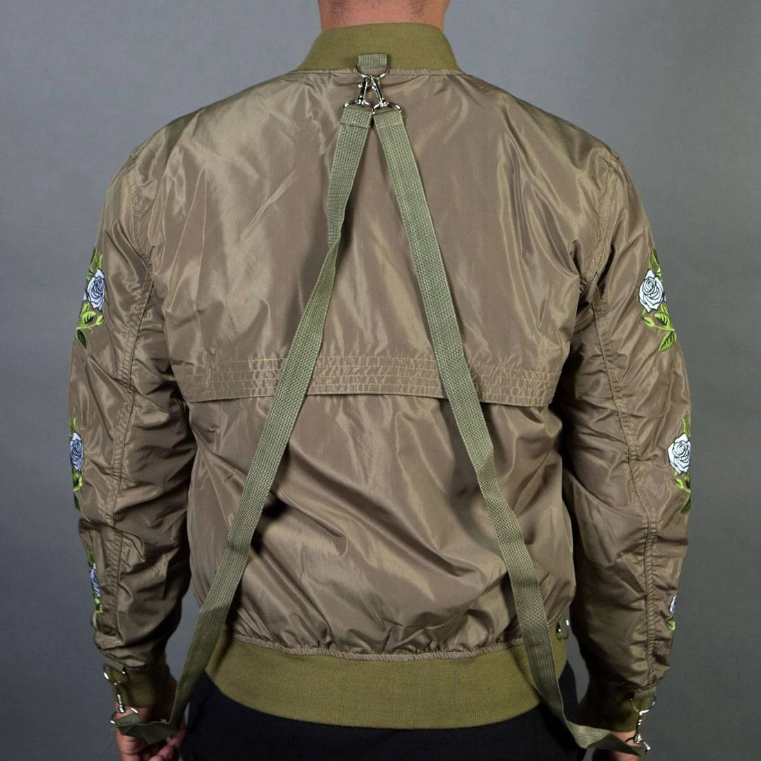 The “Rosa” Strapped Bomber Jacket – Embroidered bomber jacket featuring adjustable/removable straps that also folds up into a duffle bag. Fits true to size. For a larger/looser fit, please size up.